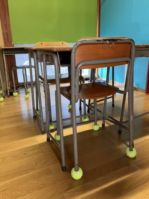 少し力が必要ですがこどもたちは楽しみながらボールをはめていきました。その結果「ギー」というあの嫌な音は消えてとても静かな学習室になりました。